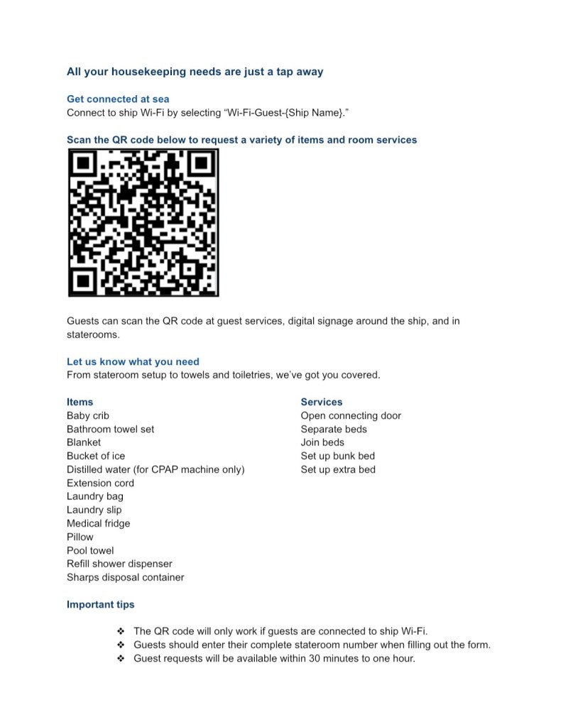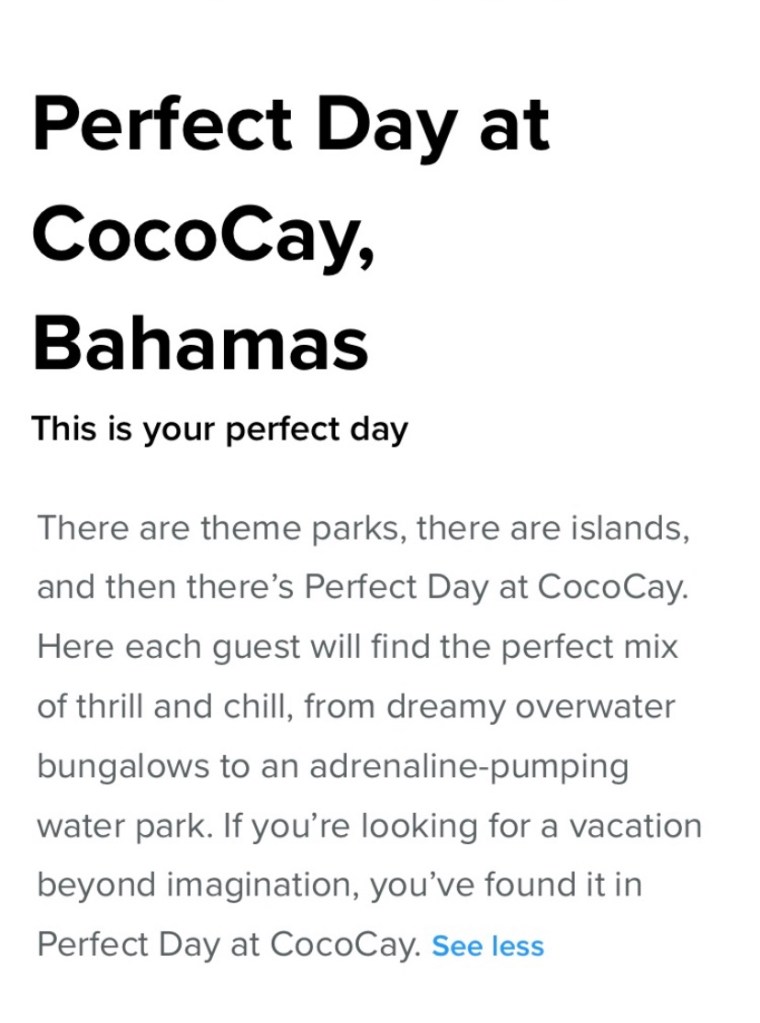 Here is content I created for the Royal Caribbean mobile app to promote Perfect Day at CocoCay, Royal Caribbean’s newest island addition.Here is copy I assisted in writing for mandatory muster drills on ships that guests can complete while using the Royal Caribbean app.Here is copy I created for digital signage onboard the ship to minimize wait times at the Guest Services Desk. Guests can tap the icon to connect to Guest Services virtually.Here is a newsletter I designed for crewmembers onboard ships to assist guests with making housekeeping requests via a feature on the Royal Caribbean app.Here is Need to Know content I wrote for the Royal Caribbean app to introduce a new feature of a live guest services chat.Here is content I created for a client’s website advertising a consulting agency for new Miami residents.Here is a Facebook post I uploaded to promote my client’s consulting agency business in Miami.Here is promotional content I created for a special event inviting prospective employees to join the Royal Caribbean team at the newest office addition in Raleigh.Here is content I created on the Royal Caribbean mobile app to describe several onboard activities on the ship, including a vocal performance, a seminar, and a music tribute concert.Here is an e-mail pitch I wrote for Tracy Aliche’s PR firm.